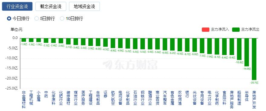 净流出方面,房地产开发、半导体、船舶制造等净流出排名靠前,其中房地产开发净流出20.74亿元。