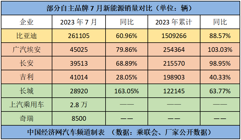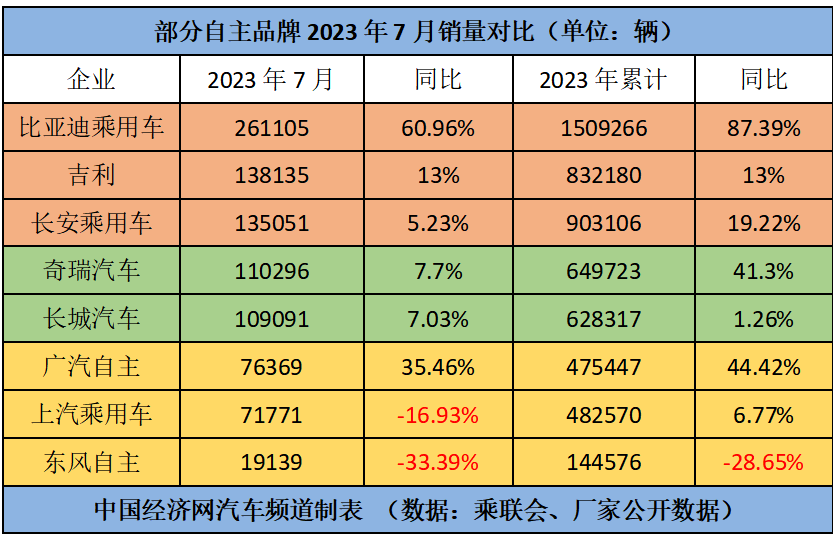 相比之下,自主品牌却喜报频传。7月,中国品牌乘用车共销售120.1万辆,同比增长11.4%,占乘用车销售总量的57.2%,比上年同期提升7.6个百分点。作为自主品牌的头部企业,并有着“自主五虎”之称的比亚迪、长安、吉利、奇瑞和长城,更是在今年下半程实现强势开局。广汽自主(传祺、埃安和昊铂)则继续以高速增长的态势紧随其后;上汽乘用车和东风自主的市场表现则相对弱势。