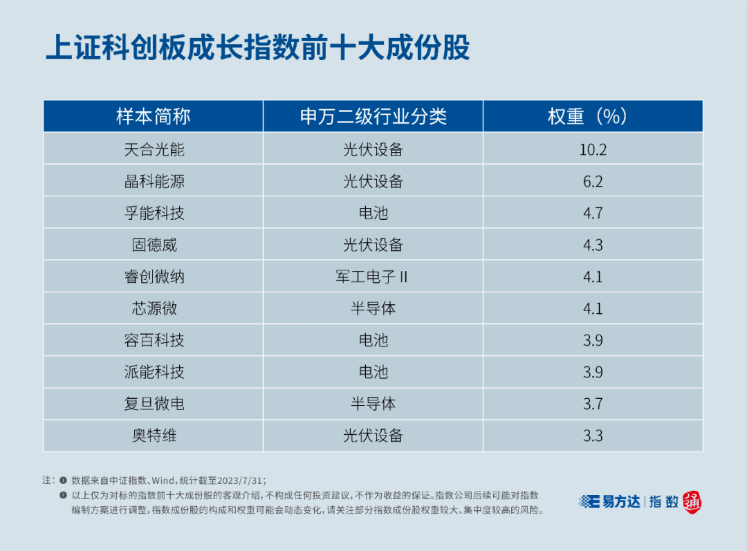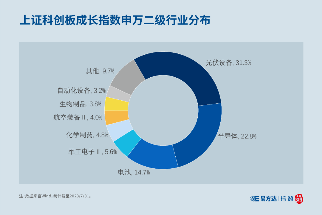 指数聚焦高成长性板块,集中布局科技前沿发展方向。按照申万二级行业分类,数据显示,截至2023年7月底,指数的前三大行业合计占比近七成。其中,光伏设备占比31%,半导体占比23%,电池占比15%,行业分布较为集中。