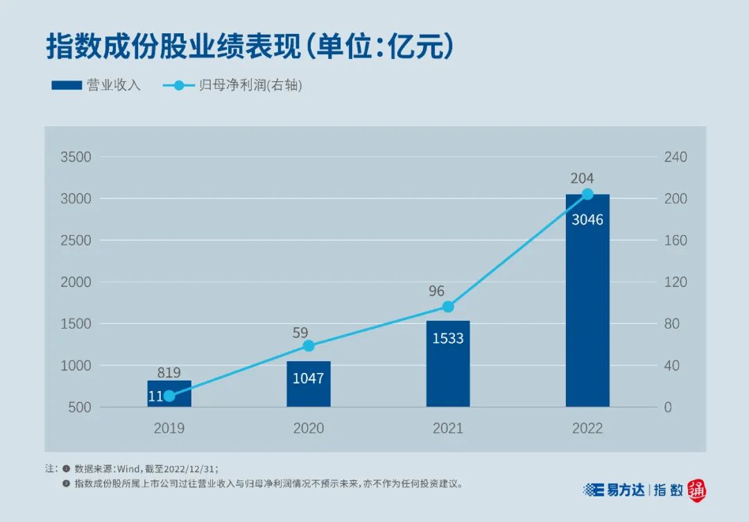 按照指数最新一期成份股计算,营收方面,指数成份股2021年、2022年营业收入分别增长46%和99%;从今年一季报来看,成份股营业收入延续了高速增长态势,同比增速达149%。