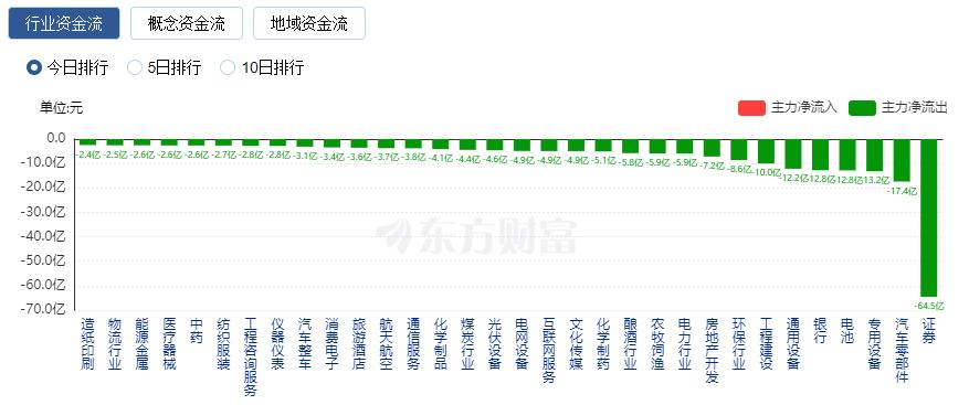 净流出方面,证券、汽车零部件、专用设备等净流出排名靠前,其中证券净流出64.54亿元。