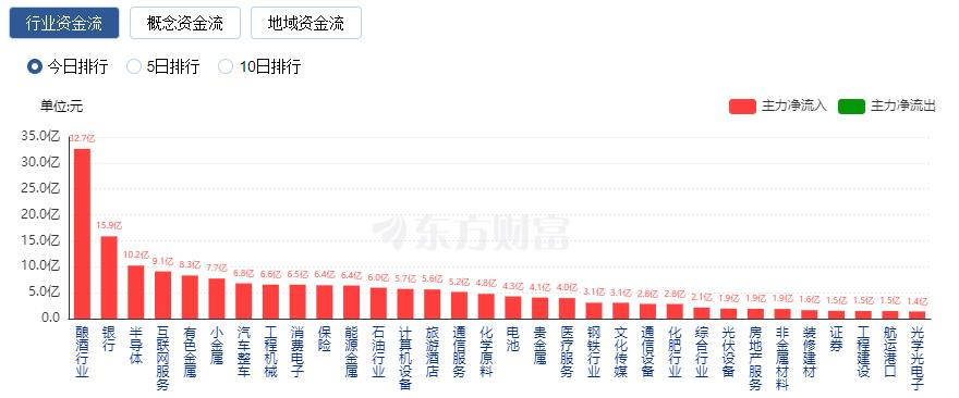 行业资金方面,截至收盘,酿酒行业、银行、半导体等净流入排名靠前,其中酿酒行业净流入32.72亿元。