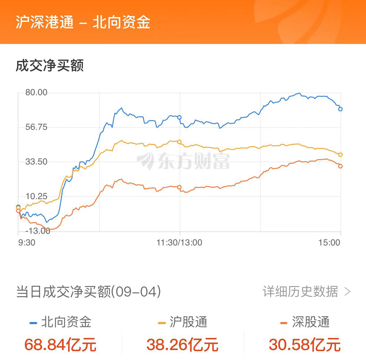 北向资金今日净流入,截至收盘,沪股通净流入38.26亿元,深股通净流入30.58亿元,合计净流入68.84亿元。
