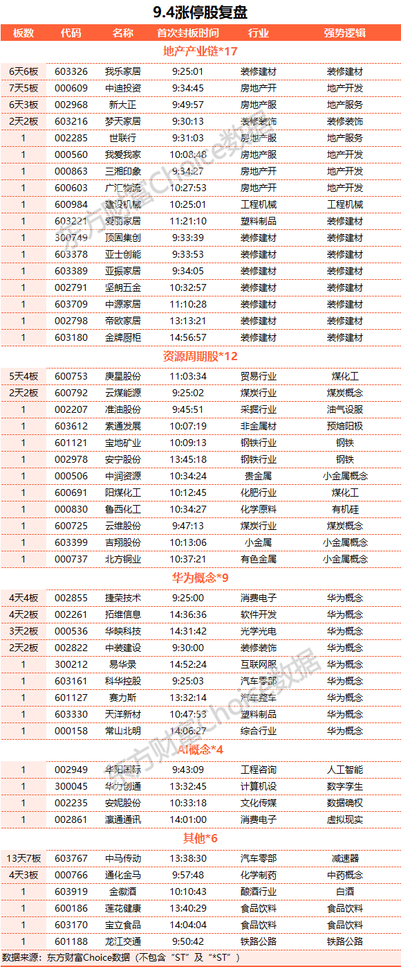 个股方面,上涨股票接近4200只。华为概念股午后大涨,华映科技、捷荣技术、拓维信息等超10股涨停。顺周期板块全天强势,油气、钢铁、煤炭、有色等板块集体大涨,准油股份、宝地矿业、云煤能源、北方铜业等涨停。地产产业链概念股持续活跃,顶固集创、中源家居、爱丽家居等多股涨停。白酒股震荡反弹,金徽酒涨停。下跌方面,次新股陷入调整,康鹏科技、盛邦安全等跌约5%。
