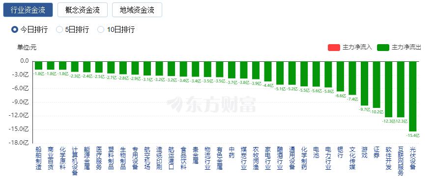 净流出方面,光伏设备、互联网服务、软件开发等净流出排名靠前,其中光伏设备净流出15.42亿元。