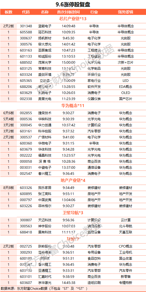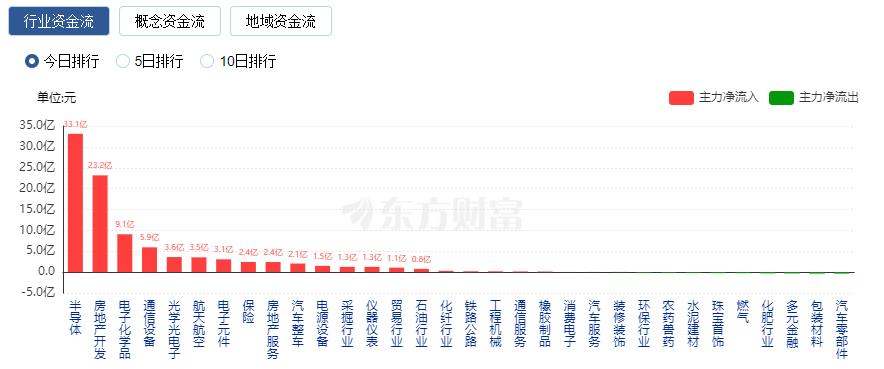 行业资金方面,截至收盘,半导体、房地产开发、电子化学品等净流入排名靠前,其中半导体净流入33.12亿元。