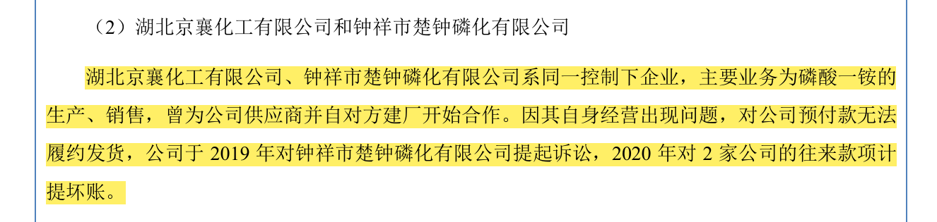 招股书显示,公司有多笔应收账款坏账,其中有多笔来自供应商。其中,湖北京襄化工有限公司全额计提627.37万元,钟祥市楚钟磷化有限公司475.51万元。需注意的是两公司系同一控制下公司,因其自身经营出现问题,对公司预付款无法履约发货。公司于2019年对钟祥市楚钟磷化有限公司提起诉讼,2020年对2家公司的往来款项计提坏账。