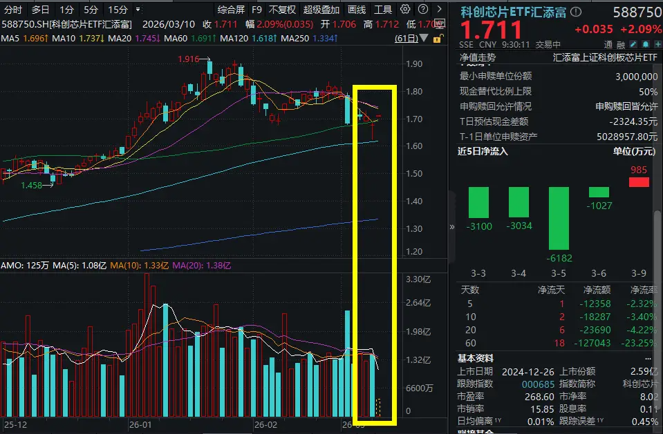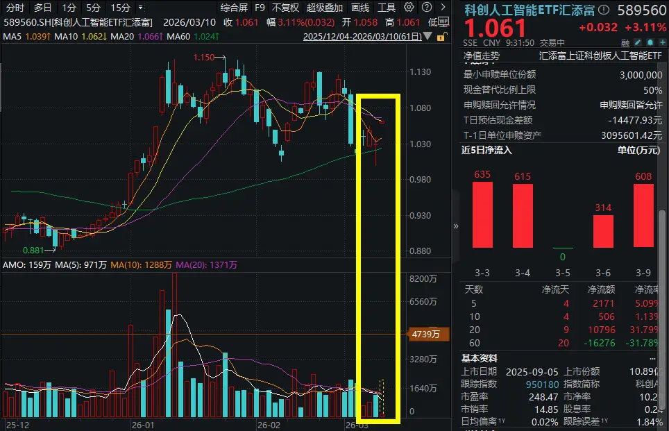 3月10日,AI主线开盘暴走,截至9:32,科创人工智能ETF汇添富(589560)开盘涨超3%,此前5日有4日吸金超2100万元!科创芯片ETF汇添富(588750)涨超2%!