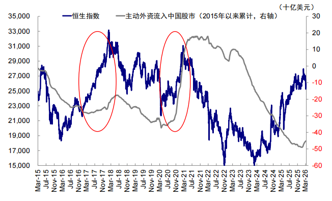 对比当前的中国,经常项下年内累计净结汇规模新高,金融账户下的直接投资净流出也在减少,而金融账户下组合投资项流出还在加大。中国经常账户顺差占GDP比例2024年以来快速抬升,从2024年一季度1.1%的低点抬升至2025年四季度的4.4%,2025年全年经常项目下银行代客净结汇规模创3083亿美元的新高。金融账户层面,截至2025年三季度,直接投资的净流出从2024年二季度的6099亿元降至2447亿元,但组合投资的净流出却仍在扩大。若从更高频的EPFR数据来看,2026年以来主动外资转为流入中国股市,但持续性仍待观察,至少与年初的股市表现依然背离。
