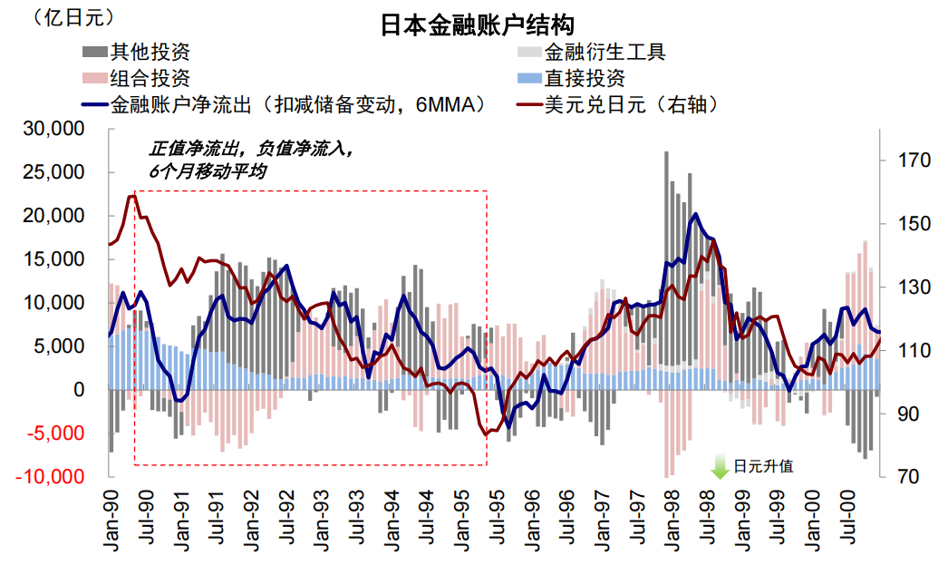 ► 经常账户顺差增加,但金融账户持续流出:如1991-1993年日元升值期间,经常账户顺差(12个月移动平均,下同)从1991年一季度的4648亿日元抬升至1993年4月1.26万亿日元。与此同时,资金流出金融账户,金融账户净流出从1991年2月的2727亿日元升至1992年7月的1.08万亿日元的高点。