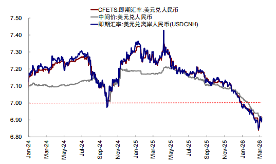 2025年下半年以来,人民币兑美元持续走强,四季度后进一步加速,继12月底突破整数关口7之后,今年2月又突破6.9,创下2023年4月以来新高。离岸人民币兑美元2025年7月以来最高累计升值5.4%,直到近期央行下调远期售汇风险准备金率和美元因为伊朗局势再度走强,升值势头才有所放缓。不少投资者预期,在外需强劲(2026年1-2月中国出口同比21.8%,再度超出预期)、大量顺差结汇、“去美元化”以及更长期的货币体系重构叙事的共同推动下,人民币还有进一步升值空间。