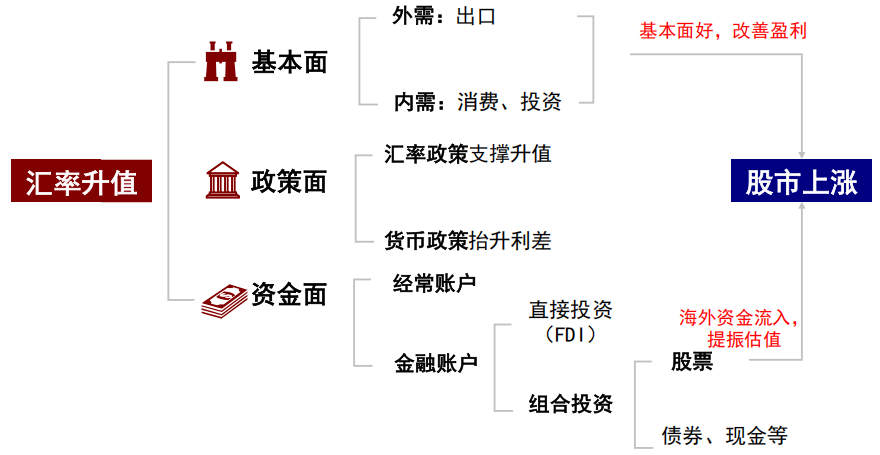 实际上,“汇率升就等于股市涨”之所以会成为不假思索的流行叙事,本质是源于基于历史经验的思维惯性,但这并非简单的“理所当然”,其成立需要建立在“汇率升=基本面好”和“汇率升=海外资金流入股市”这两个关键前提上。跳过分析这两个前提是否成立,就直接得出结论,恐怕是最大的逻辑漏洞。