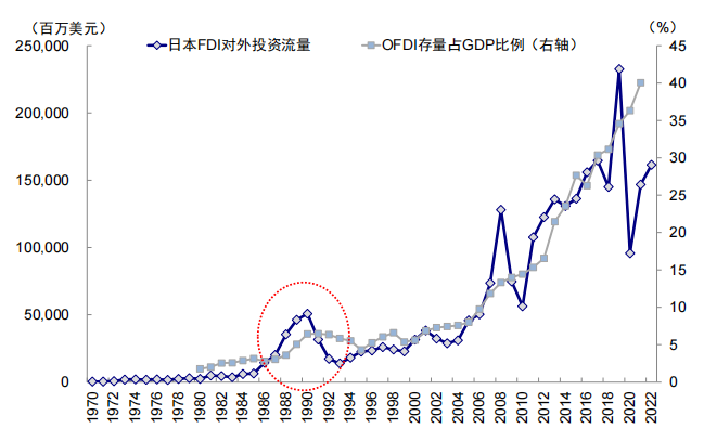 ► 金融账户下的直接投资流入:如1990-1993年日本金融账户下资金边际流入直接投资但流出组合投资,其中直接投资的净流出从1990年7月的6566亿日元缩窄至1993年4月的1428亿日元,而组合投资从净流入转为净流出。进一步看,直接投资的净减少主要是因为日本减少对外FDI,其对外直接投资(OFDI)流量从1990年的508亿美元降至1993年最低139亿美元,OFDI存量占GDP比例也从1990年6.4%降至1995年的4.3%。