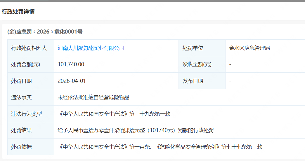 此外,公司主要供应商还存在明显的合规风险。报告期内,双英集团对河南大川聚氨酯实业有限公司(以下简称“河南大川”)的采购金额逐年攀升,分别为599.54万元、1557.75万元、1796.55万元。但公开资料显示,2026年4月1日,河南大川因未经依法批准擅自经营危险物品,被金水区应急管理局依据《中华人民共和国安全生产法》第一百条、《危险化学品安全管理条例》第七十七条第三款,处以101740元(人民币壹拾万零壹仟柒佰肆拾元整)的行政处罚。核心供应商的合规隐患,进一步加剧了双英集团上市之路的不确定性。多重风险交织下,双英集团的第四次IPO冲刺,不仅考验其合规经营能力,更关乎实控人的债务安危与企业的长远存续。