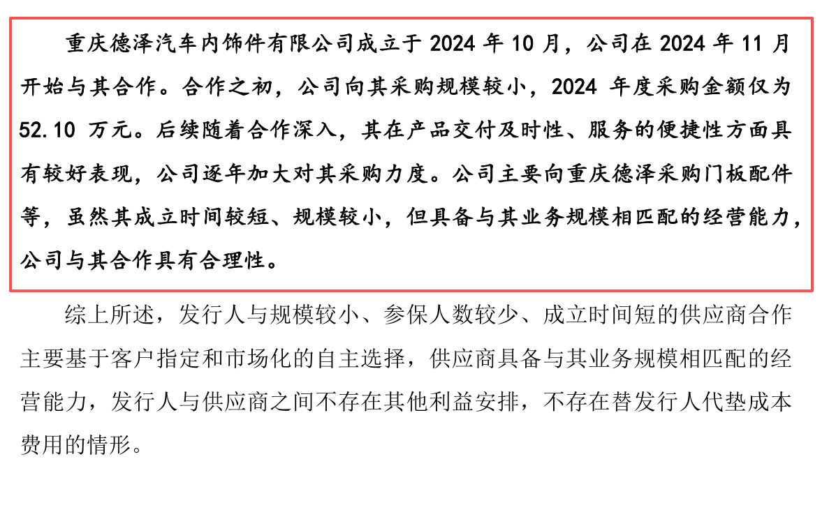 在供应商合作方面,双英集团同样存在诸多疑点。披露信息显示,重庆德泽汽车内饰件有限公司(以下简称“重庆德泽”)于2024年10月28日正式成立,然而双英集团在2024年便向其采购了52.10万元货物,2025年采购金额更是激增至3660.86万元(增幅达6928%),短短一年时间增幅惊人,异常态势明显。