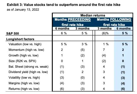 “价值股在最近的加息周期开始时普遍表现优于大盘。具有高质量属性的股票,如强劲的资产负债表和高资本回报率,在第一次加息之前往往落后于大盘,但在加息开始后的几个月跑赢大盘。”
