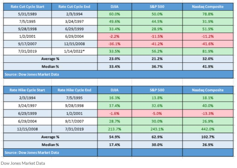 财经媒体MarketWatch利用道琼斯追溯到1989年的数据也得出类似结论,即在美联储加息期间,道指整体平均回报率接近55%,标普500指数平均回报率为62.9%,纳指平均回报率为102.7%。同时,美联储降息期间也带来股市强劲收益,道指平均上涨23%,标普涨21%,纳指涨32%。这种差异可能是因为降息往往发生在经济疲软的时期,加息则在经济过热时发生: