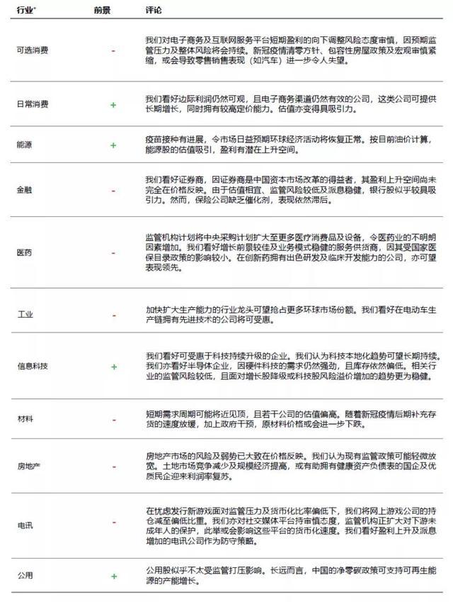 *备注︰汇丰环球投资管理离岸中国股票团队的行业观点:「+」=正面、「–」=负面、「O」=中性