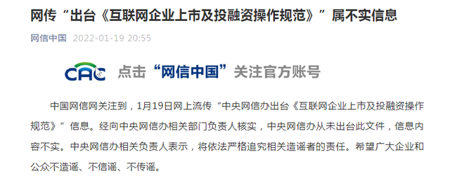 中华网财经1月20日讯,据网信中国微信公众号,中国网信网关注到,1月19日网上流传“中央网信办出台《互联网企业上市及投融资操作规范》”信息。经向中央网信办相关部门负责人核实,中央网信办从未出台此文件,信息内容不实。中央网信办相关负责人表示,将依法严格追究相关造谣者的责任。希望广大企业和公众不造谣、不信谣、不传谣。