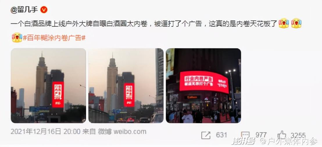 如今,各行各业内卷现象严重,不管是做甲方还是做乙方,都陷入了内卷的潮流中。如何快速出圈,成为广告运营商拿下品牌主的砝码。近日,有网友在微博爆料,在广州、深圳街头的户外大牌上发现了一则内卷广告。
