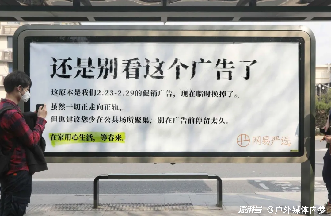 因为疫情的缘故,道路上的人群少了,户外广告的曝光和效果大打折扣。但是合同又已签订,无法改期。于是网易严选便将纯商业性质的促销广告改成了带有温馨提示的“公益广告”。这一举动使原本只在本地传播的户外广告被搬运到网上进行广泛传播,得到了广大网友的纷纷好评,品牌曝光度和好感度倍增。