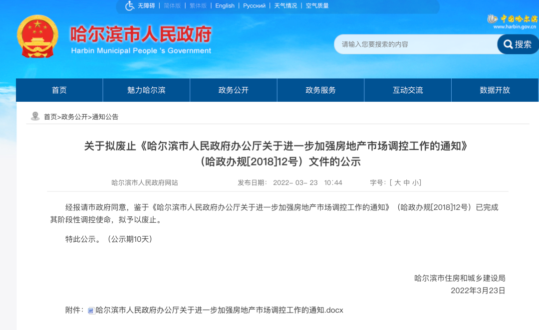 据哈尔滨市人民政府网站23日消息,鉴于《哈尔滨市人民政府办公厅关于进一步加强房地产市场调控工作的通知》已完成其阶段性调控使命,拟予以废止。2018年5月5日,哈尔滨实行区域性限售政策,政策规定在主城区6区区域范围内,取消建设单位网签合同备案信息注销权限,凡新购买商品住房的,自商品房网签合同签订之日起满3年可上市交易。