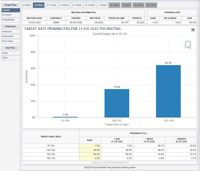 截至今晨5点,芝商所利率观察工具(CME FedWatch Tool)显示,5月上调利率50个基点的概率为66.1%,一周前加息50个基点的概率为50.5%;6月利率升至1.25%~1.5%的概率高达64.2%。