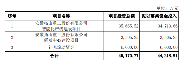 招股书显示拓山重工为集工程机械零部件及总成研发、设计、生产、销售与服务为一体的企业,公司的主要产品包括链轨节、销套、支重轮、销轴、制动装置系列等,主要应用于挖掘机、推土机等履带式工程机械设备的行走机构。本次公开发行拟募集资金4.4亿元,用于安徽拓山重工股份有限公司 智能化产线建设项目以及安徽拓山重工股份有限公司研发中心建设项目和补充流动资金6000万元。