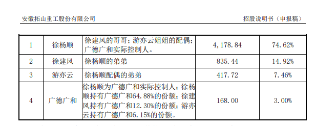 招股书显示徐杨顺直接持有拓山重工 4,178.84 万股, 占公司总股本的 74.62%,通过担任广德广和管理投资合伙企业(有限合伙)普 通合伙人而间接控制公司 168 万股,占公司总股本的 3.00%,合计直接持有及间接控制公司总股本的 77.62%,为公司的控股股东、实际控制人。