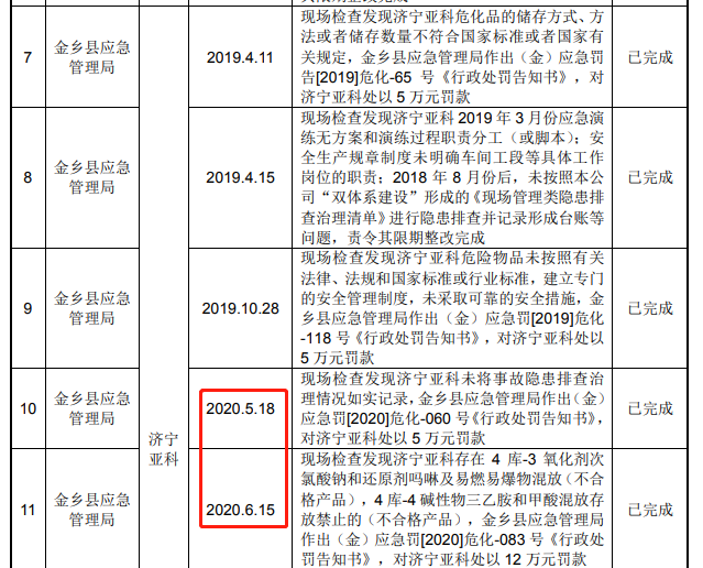 其中负责生产的子公司济宁亚科更是11条涉及安全问题的整改和处罚信息,而且屡罚屡犯,在2020年5月份现场检查发现济宁亚科未将事故隐患排查治 理情况如实记录,金乡县应急管理局作出(金) 应急罚[2020]危化-060 号《行政处罚告知书》, 对济宁亚科处以 5 万元罚款。