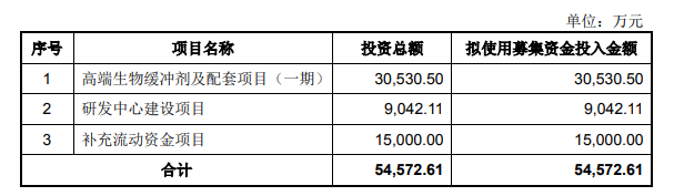招股书显示,亚科股份本次公开发行拟募集资金5.5亿元,用于高端生物缓冲剂及配套项目(一期)以及研发中心建设项目和补充流动资金1.5亿元。