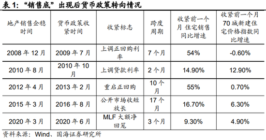 但在另一方面,也不必过度担忧地产销售趋势性回暖后,货币政策会根据房地产回暖进行收紧,从而引发债市利率大幅上行。因为从过去5轮“销售底”出现后、货币政策收紧的情况来看,货币政策根据房地产市场进行调控需要有两个条件:一是房价增速在0%以上;二是住宅销售增速回升到10%左右。
