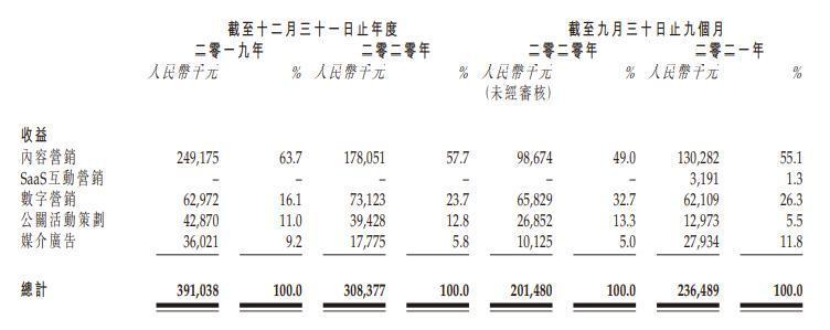 然而,《投资时报》研究员发现,上述趋势并不能反映出公司已针对疫情调整了业务发展重心,从2021年前9个月的数据来看,数字内容营销收入占比较上年同期再次出现下降,内容营销仍以活动内容营销为主,仍有较大受疫情冲击的风险。
