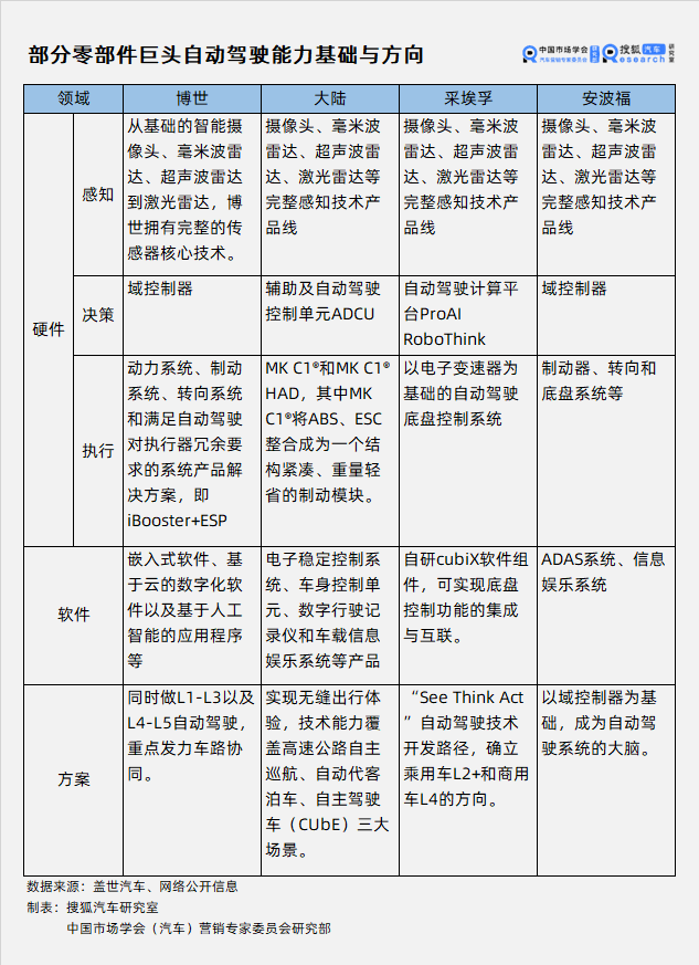 博世、大陆、采埃孚、安波福等Tier 1企业的发展信息显示,从硬件、软件到方案,企业之间的差异性越来越小,最终将殊途同归。只不过,现阶段的差异性完全建立在原有硬件业务的基础之上。