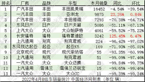 部分合资B级车4月销量统计 数据来源:乘联会