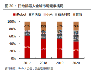 在扫地机器人全球市场份额方面,尽管iRobot市场份额在逐年下滑,但依旧稳居龙头地位,而在国内的品牌中,石头科技前有科沃斯、后有小米,正受到各方夹击。