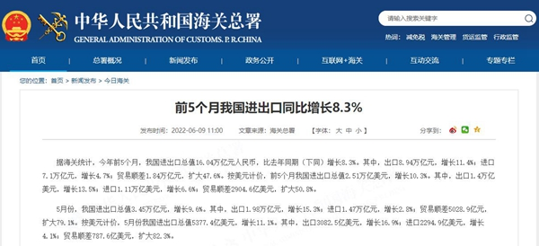 中国经济网6月10日讯(记者 郭跃)昨日,海关总署发布数据,今年前5个月,我国进出口总值16.04万亿元人民币,同比增长8.3%。其中,出口8.94万亿元,增长11.4%;进口7.1万亿元,增长4.7%;贸易顺差1.84万亿元,扩大47.6%。