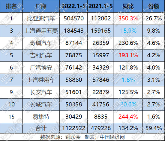 在乘联会发布的5月新能源乘用车批发销量厂商排名(TOP15)中,传统品牌新能源虽相比4月市场份额略有下降,但依然占据超过六成份额,达到64.8%。其5月共销售27.2万辆,同比增长157%,占据TOP15中的10席,并包揽了前9排名中除特斯拉以外的所有席位;1-5月,传统品牌新能源累计销售112.3万辆,同比增长134.2%,份额亦是接近六成。