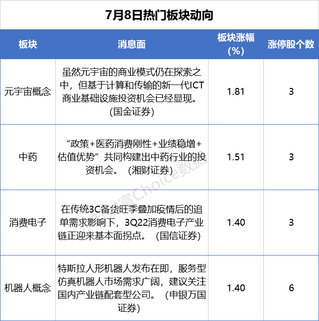 今日(7月8日)沪深两市全线高开低走,三大指数表现分化,创业板指颓势明显,沪指相对抗跌,全天市场热点较为散乱,呈现快速轮动特征。