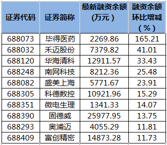 统计显示,10月12日共有226只科创板个股融资余额环比增加。其中,16股融资余额增幅超过10%。融资余额增幅最大的是毕得医药,最新融资余额为2269.86万元,环比增幅达165.21%;融资余额增幅较大的还有禾迈股份、华海清科、南网科技、盛美上海、科德数控等股。