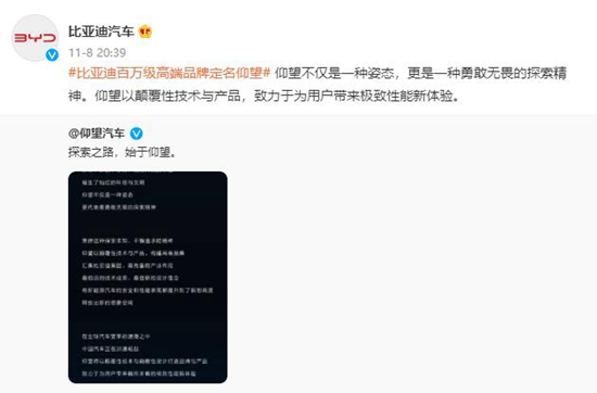 比亚迪推出高端品牌一事终于尘埃落定,11月8日晚,比亚迪汽车正式公布了高端品牌并定名“仰望”。