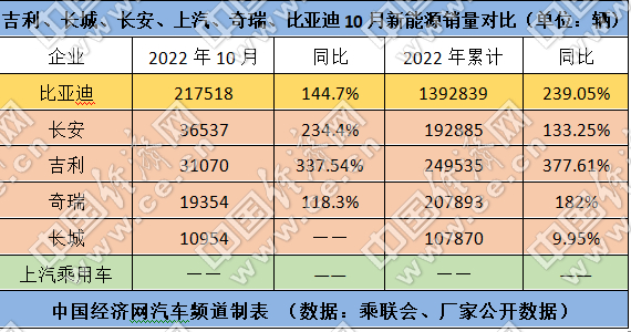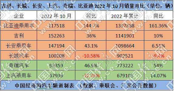 中国经济网记者通过梳理厂家公开的数据和乘联会发布的数据发现,10月,比亚迪乘用车、吉利、长安乘用车、长城、奇瑞、上汽乘用车的销量分别为217518辆、152263辆、147194辆、100208辆、93359辆、67939辆,同比分别上涨144.7%、36%、43.1%、-10.58%、46.9%、-32.06%;前10个月的累计销量分别为1397888辆、1141901辆、1098664辆、902521辆、773222辆、679105辆,同比分别上涨161.36%、10%、6.51%、-9.4%、54%、14.07%。
