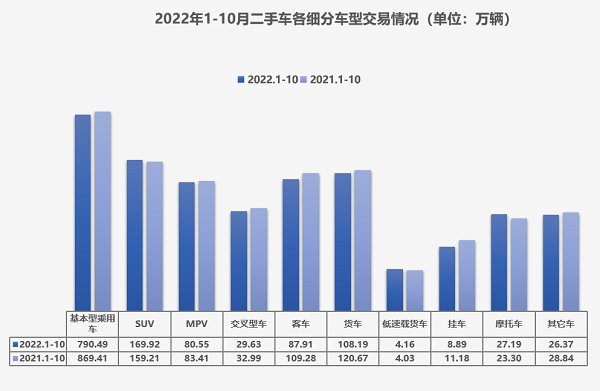 最新数据显示,今年1-10月,全国二手车市场累计交易量1333.30万辆,同比下降7.6%。基本型乘用车共交易790.49万辆,同比下降9.1%;SUV共交易169.92万辆,同比增长6.7%;MPV共交易80.55万辆,同比下降3.4%;交叉型乘用车共交易29.63万辆,同比下降10.2%。流通协会预计,11月全国二手车交易量约为127万辆,同比将下降17.5%。