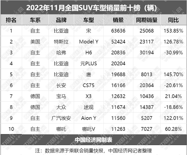 另外两款入榜SUV销量前十的新能源车型虽仅排名榜单末尾,但都是从未入过榜的新面孔。11月,广汽Aion Y售出11560辆,同比增长122.01%,排名第9。曾几何时,广汽传祺GS4也是自主SUV中的佼佼者,但自其陨落后,广汽阵营中几乎再无响当当的明星SUV产品,而Aion Y的崛起,或将助力广汽的自主事业实现突破。