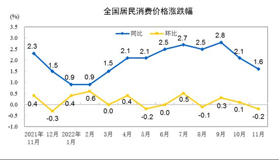 国家统计局数据显示,2022年11月,全国CPI环比下降0.2%,同比上涨1.6%。同比涨幅较10月明显回落,时隔7个月重回“1时代”。