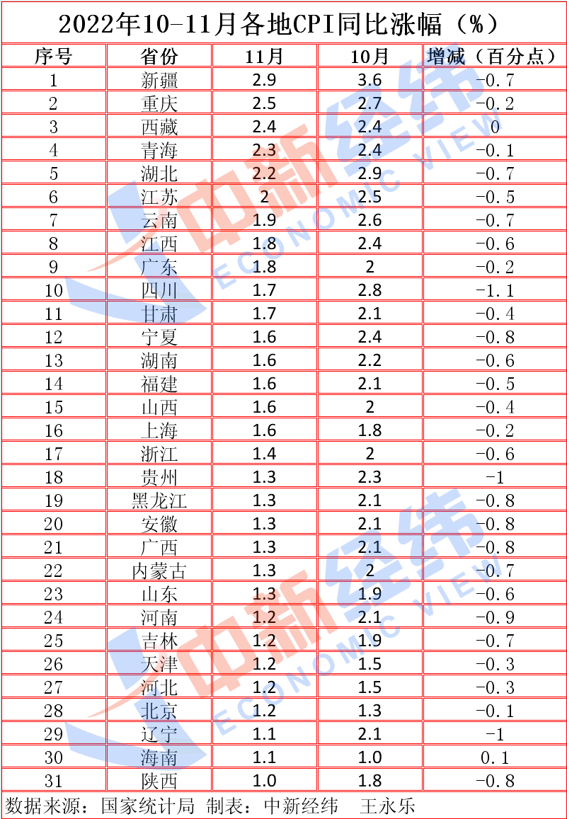 中新经纬12月13日电 (王永乐)日前,国家统计局公布了31省份2022年11月居民消费价格指数(CPI)。中新经纬梳理发现,11月,29省份CPI同比涨幅低于上月。其中,新疆最高为涨2.9%,陕西最低涨1.0%。