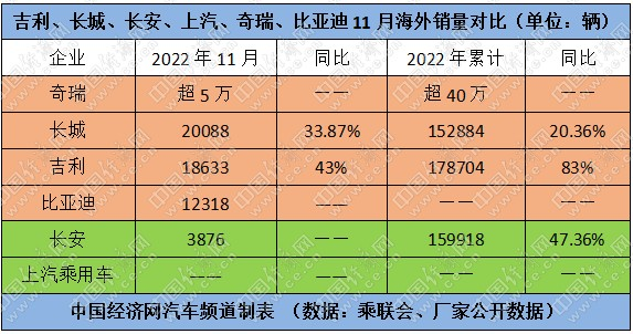 相比之下,长城、吉利、长安等在海外市场的销量规模尚有很大的提升空间。具体来看,11月,吉利、长城和长安的销量分别为20088辆、18633辆、3876辆;1-11月累计销量分别为152884辆、178704辆、159918辆。