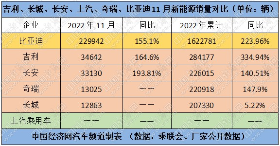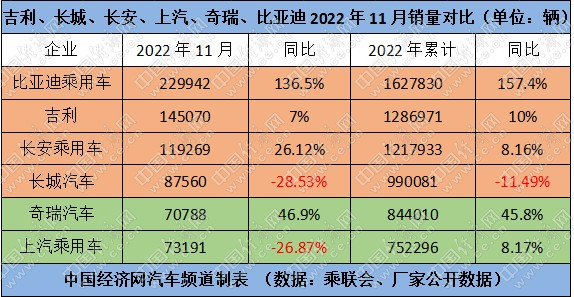 数据显示,11月,比亚迪乘用车、吉利、长安乘用车、长城、奇瑞、上汽乘用车的销量分别为229942辆、145070辆、119269辆、87560辆、70788辆、73191辆,同比分别上涨136.5%、7%、26.12%、-28.53%、46.9%、-26.87%;前11个月的累计销量分别为1627830辆、1286971辆、1217933辆、990081辆、844010辆、752296辆,同比分别上涨157.4%、10%、8.16%、-11.49%、45.8%、8.17%。