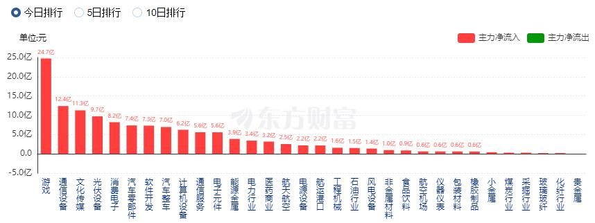 行业资金方面,截至收盘,游戏、通信设备、文化传媒等净流入排名靠前,其中游戏净流入24.73亿元。