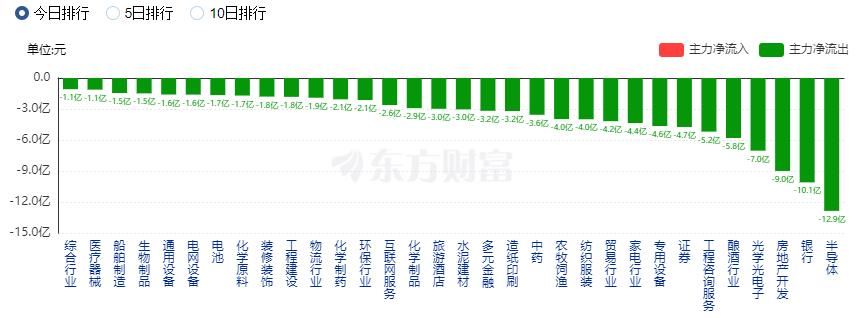 净流出方面,半导体、银行、房地产开发等净流出排名靠前,其中半导体净流出12.86亿元。